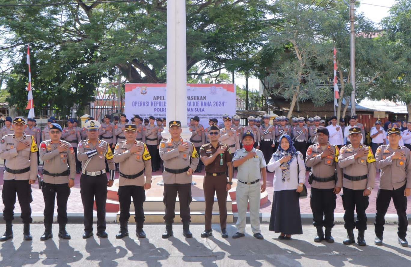 Sanana,Transtimur.com-Kepala Kepolisian Resor Kepulauan Sula, AKBP Kodrat Muh Hartanto, S.I.K., memimpin apel gelar pasukan Operasi “Zebra Kie Raha 2024” yang berlangsung di Lapangan Apel Mapolres Sula, Senin (14/10/2024),