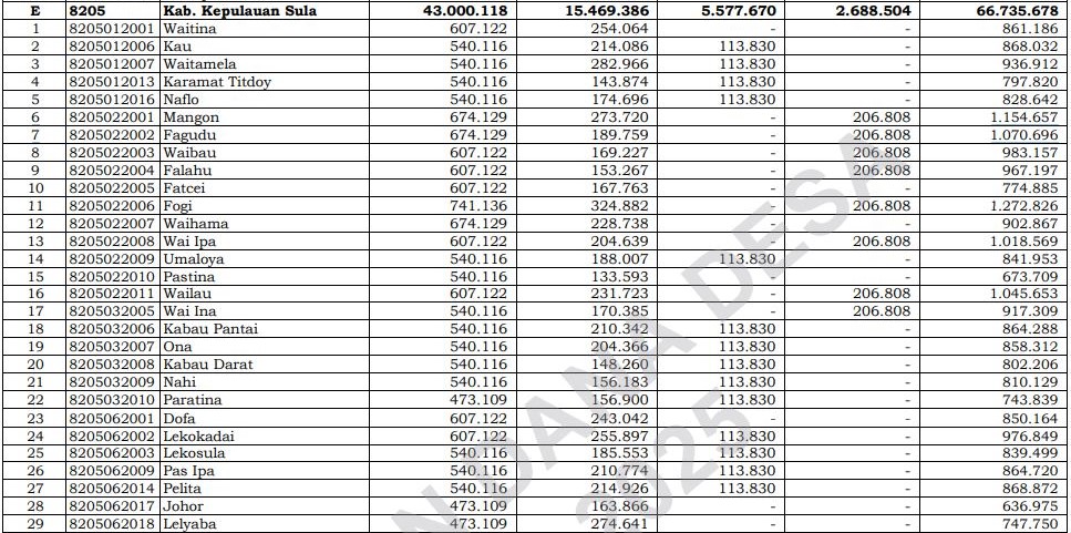 Menurut data yang dikantongi pada Jumat (3/1/2025) menyebutkan, setiap desa di Kepulauan Sula akan menerima dana yang bervariasi, tergantung pada jumlah penduduk dan tingkat kemiskinan masing-masing desa.