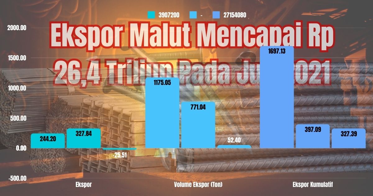 Ekspor Maluku Utara pada Juli 2021 didominasi oleh golongan barang Besi dan Baja (HS 72) yang dikirim ke Tiongkok, Korea Selatan, dan Taiwan, serta Nikel (HS 75) yang diekspor ke Tiongkok. Secara kumulatif, ekspor Maluku Utara dari Januari hingga Juli 2021 mencapai US$1,697 miliar (sekitar Rp26,4 triliun), mengalami lonjakan 327,39 persen dibanding periode yang sama pada tahun sebelumnya yang hanya sebesar US$397,09 juta (sekitar Rp6,2 triliun). Volume ekspor juga meningkat 52,40 persen, dari 771,04 ribu ton pada 2020 menjadi 1,175 juta ton pada 2021.