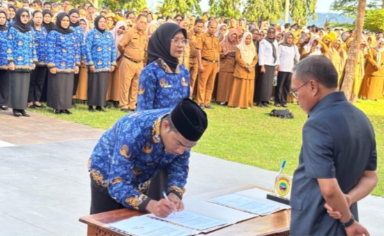 Halteng, Transtimur.com – Bupati Halmahera Tengah, Ikram Malan Sangadji, secara langsung memimpin apel sore yang dirangkaikan dengan penyerahan Surat Keputusan (SK) Pegawai Pemerintah dengan Perjanjian Kerja (PPPK) yang didampingi oleh Wakil Bupati, Ahlan Djumadil dan Sekertaris Daerah, Bahri Sudirman. Acara tersebut berlangsung dihalaman kantor Bupati pada Selasa (30/09/2025) sore.